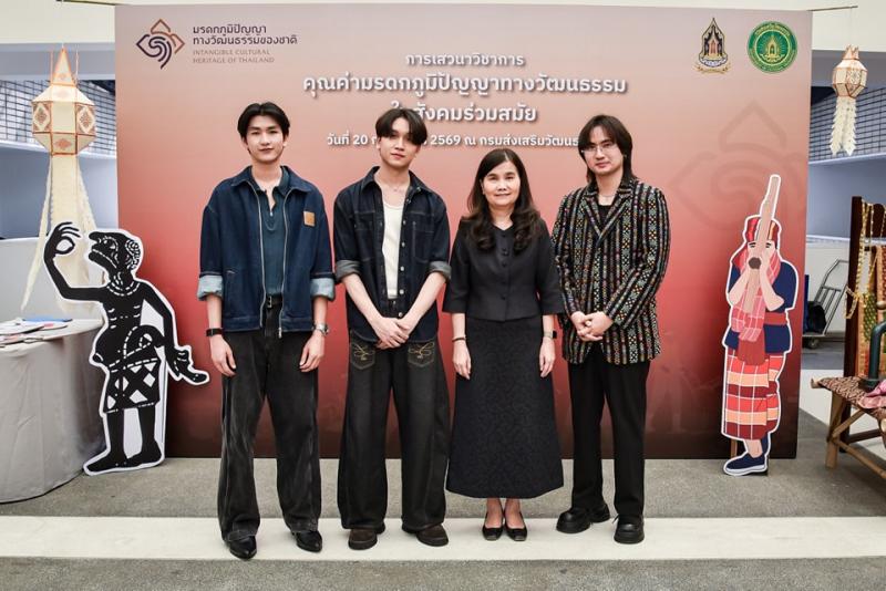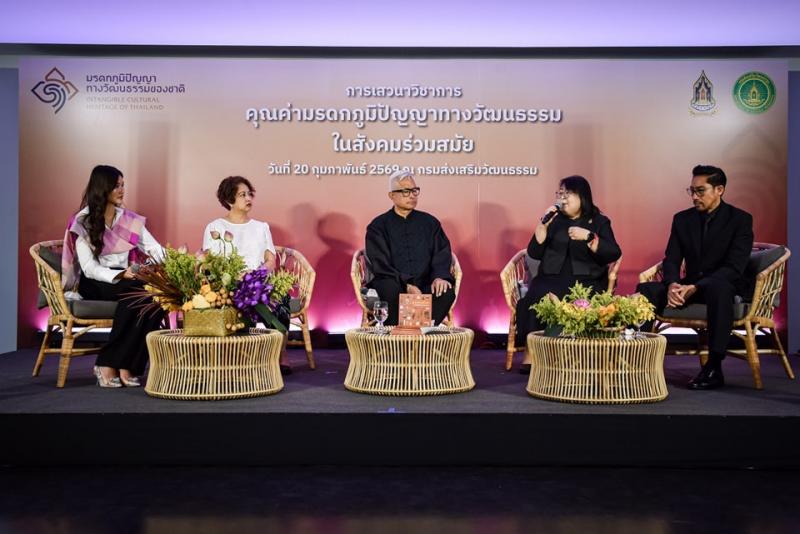 วันศุกร์ที่ 20 กุมภาพันธ์ 2569 เวลา 09.00 น. นางยุถิกา อิศรางกูร ณ อยุธยา อธิบดีกรมส่งเสริมวัฒนธรรม เป็นประธานเปิดงานเสวนาวิชาการ "คุณค่ามรดกภูมิปัญญาทางวัฒนธรรมในสังคมร่วมสมัย” และการเปิดตัวหนังสือ "ขุมทรัพย์ล้ำค่ามรดกภูมิปัญญาทางวัฒนธรรม” โดยมีนางสาวกิตติพร ใจบุญ ผู้เชี่ยวชาญด้านภูมิปัญญา ปฏิบัติหน้าที่ผู้อำนวยการกองมรดกภูมิปัญญาทางวัฒนธรรม ผู้ทรงคุณวุฒิ วิทยากร อาจารย์ นักเรียน นักศึกษา เข้าร่วมงาน ณ ชั้น 2 อาคารนิทรรศการและบริการทางการศึกษา ศูนย์วัฒนธรรมแห่งประเทศไทย