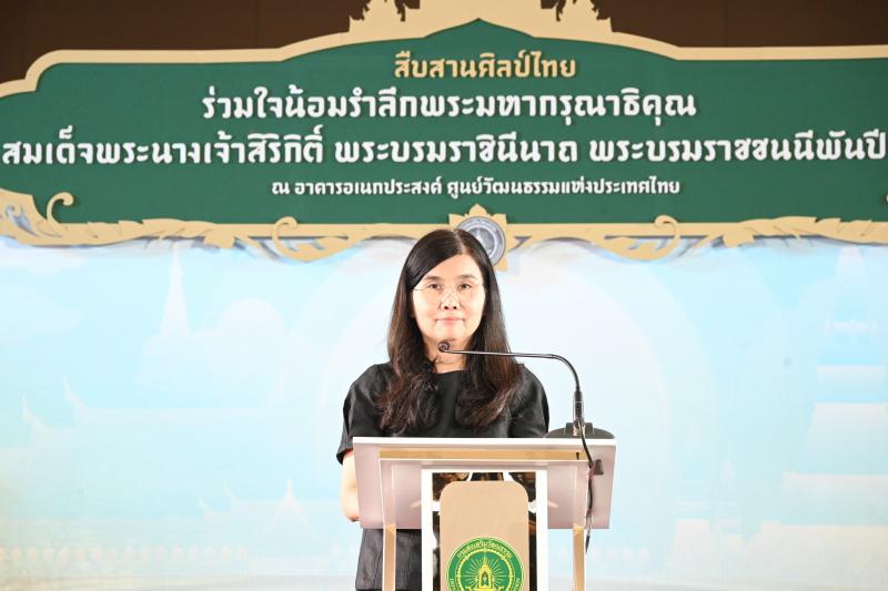 นางยุถิกา อิศรางกูร ณ อยุธยา อธิบดีกรมส่งเสริมวัฒนธรรม กล่าวว่า กิจกรรมสืบสานศิลป์ไทย ร่วมใจน้อมรำลึกพระมหากรุณาธิคุณ สมเด็จพระนางเจ้าสิริกิติ์ พระบรมราชินีนาถ พระบรมราชชนนีพันปีหลวง ภายใต้โครงการเปิดศูนย์วัฒนธรรมแห่งประเทศไทยเป็นแหล่งเรียนรู้ทางวัฒนธรรม เป็นการใช้พื้นที่ให้ศูนย์วัฒนธรรมให้เกิดประโยชน์อย่างสูงสุด เป็นการเปิดโอกาสให้เด็ก เยาวชน และประชาชนทั่วไป ได้มีพื้นที่แสดงออกและถ่ายทอดศิลปวัฒนธรรมอย่างสร้างสรรค์ และโครงการนี้จัดขึ้นในห้วงเวลาของการจัดแสดงโขนมูลนิธิศิลปาชีพ ในสมเด็จพระนางเจ้าสิริกิติ์ พระบรมราชินีนาถ พระบรมราชชนนีพันปีหลวง ตอน "สัตยาพาลี” เพื่อน้อมรำลึกในพระมหากรุณาธิคุณและสืบสานพระปณิธานของสมเด็จพระนางเจ้าสิริกิติ์ พระบรมราชินีนาถ พระบรมราชชนนีพันปีหลวง ผู้ทรงทำนุบำรุงศิลปวัฒนธรรม โดยเฉพาะศิลปะการแสดง ให้คงอยู่คู่แผ่นดินไทยอย่างสง่างาม กรมส่งเสริมวัฒนธรรมขอขอบคุณศิลปินแห่งชาติ ศิลปินศิลปาธร คณะนักแสดง และเครือข่ายด้านศิลปวัฒนธรรมทุกแห่ง ที่ทำให้กิจกรรมการแสดงในโครงการนี้มีความหลากหลาย ทั้งการแสดงเชิงอนุรักษ์ พื้นบ้าน สร้างสรรค์ การขับร้องประสานเสียง การบรรเลงดนตรีสากล และการแสดงร่วมสมัย ซึ่งทุกท่านมีความตั้งใจร่วมน้อมรำลึกในพระมหากรุณาธิคุณ และร่วมกันเป็นกำลังสำคัญในการสืบสานมรดกทางศิลปวัฒนธรรมของชาติให้คงอยู่สืบไป