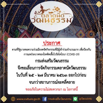สวธ.ขอเลื่อนการจัดกิจกรรมตลาดนัดวัฒนธรรม ในวันที่ ๒๕ - ๒๗ มีนาคม ๒๕๖๓ ออกไปก่อน จนกว่าสถานการณ์จะคลี่คลาย