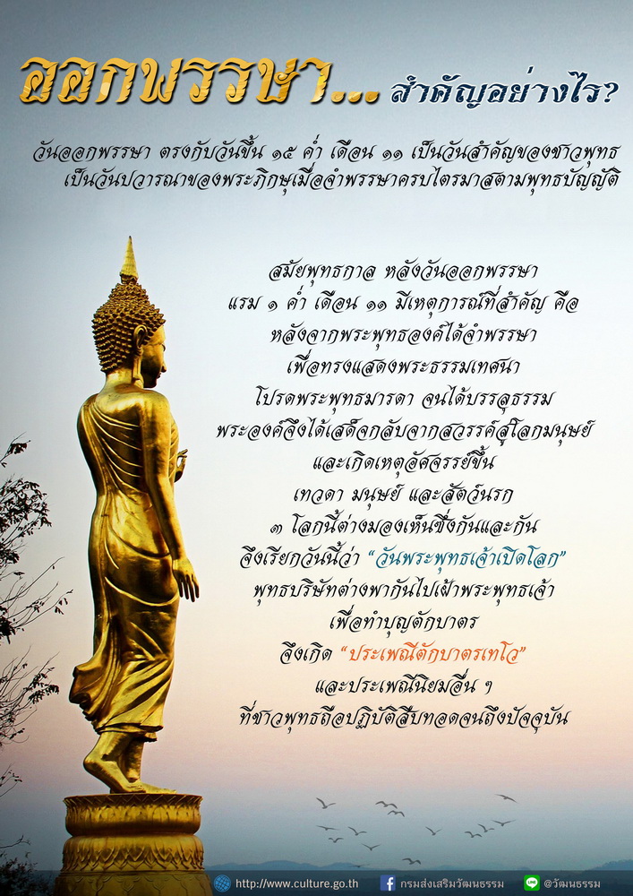 วันออกพรรษา เป็นวันสำคัญวันหนึ่งในทางพระพุทธศาสนา ซึ่งปีนี้ ตรงกับวันอาทิตย์ที่ ๑๓ ตุลาคม พุทธศักราช ๒๕๖๒ เป็นวันที่พระสงฆ์อยู่จำพรรษาครบไตรมาศ ๓ เดือนในช่วงฤดูฝน ตามพระพุทธบัญญัติ ซึ่งเริ่มมาตั้งแต่วันแรม ๑ ค่ำ เดือน ๘ แล้วมาออกพรรษาในวันขึ้น ๑๕ ค่ำ เดือน ๑๑