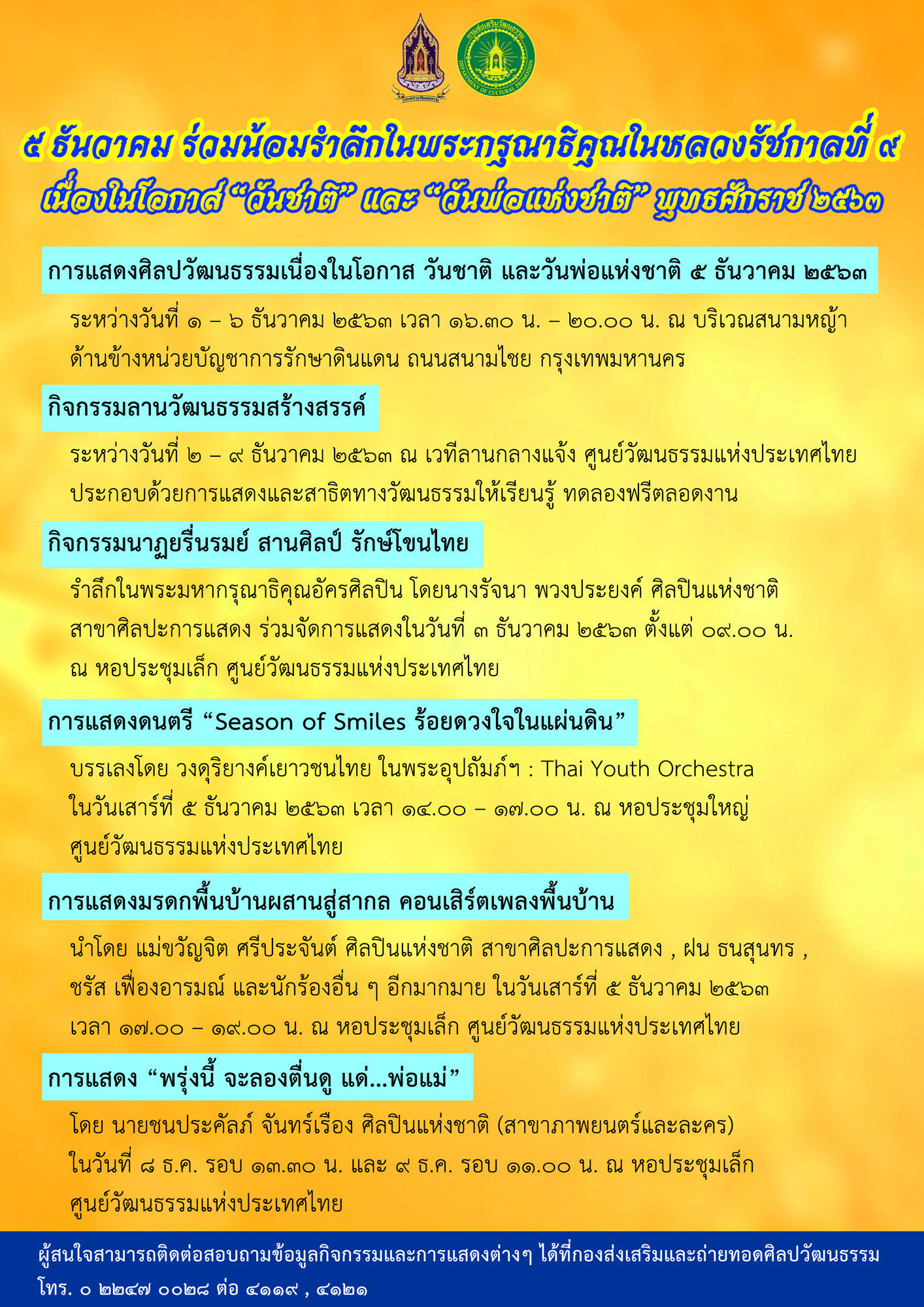 นายชาย นครชัย อธิบดีกรมส่งเสริมวัฒนธรรม กล่าวว่า ๕ ธันวาคม ของทุกปีนับเป็นวันสำคัญของพวกปวงชนชาวไทย เนื่องในโอกาส "วันชาติ” และ "วันพ่อแห่งชาติ” อันเป็นวันคล้ายวันพระราชสมภพของพระบาทสมเด็จพระบรมชนกาธิเบศร มหาภูมิพลอดุลยเดชมหาราช บรมนาถบพิตร ในรัชกาลที่ ๙ พระมหากษัตริย์ไทยแห่งราชวงศ์จักรี ตลอดรัชสมัยทรงเป็นพระมหากษัตริย์ทรงงานหนักที่สุดในโลก ทรงประกอบพระราชกรณียกิจน้อยใหญ่นานัปการ เพื่อประโยชน์สุขของพสกนิกรชาวไทยจนเป็นที่ประจักษ์ ด้วยน้อมสำนึกในพระมหากรุณาธิคุณอย่างหาที่สุดมิได้ กรมส่งเสริมวัฒนธรรม (สวธ.) โดยกองส่งเสริมและถ่ายทอดศิลปวัฒนธรรม ได้กำหนดกิจกรรมและการแสดงเพื่อเทิดพระเกียรติอย่างหลากหลาย เพื่อให้ทุกภาคส่วนได้มีส่วนร่วมในการน้อมสำนึกในพระมหากรุณาธิคุณ ระหว่างวันที่ ๑ – ๙ ธันวาคม นี้ ประกอบด้วย