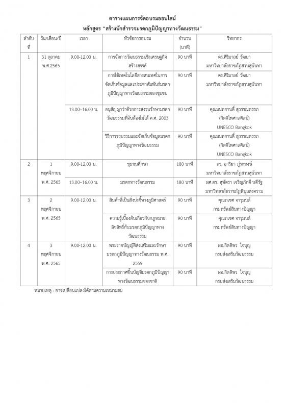 กล่าวต่อว่า สำหรับหัวข้อที่เปิดอบรมมีทั้งหมด ๑๐ หัวข้อ ได้แก่ การจัดการวัฒนธรรมเชิงเศรษฐกิจสร้างสรรค์ มรดกทางวัฒนธรรม ชุมชนศึกษา สินค้าที่เป็นสิ่งบ่งชี้ทางภูมิศาสตร์ อนุสัญญาว่าด้วยการสงวนรักษามรดกวัฒนธรรมที่จับต้องไม่ได้ ค.ศ. 2003 พระราชบัญญัติส่งเสริมและรักษามรดกภูมิปัญญาทางวัฒนธรรม พ.ศ. ๒๕๕๙ การประกาศขึ้นบัญชีมรดกภูมิปัญญาทางวัฒนธรรมของชาติ ความรู้เบื้องต้นเกี่ยวกับกฎหมายลิขสิทธิ์กับมรดกภูมิปัญญาทางวัฒนธรรม วิธีการรวบรวมและจัดเก็บข้อมูลมรดกภูมิปัญญาทางวัฒนธรรม และการใช้เทคโนโลยีสารสนเทศในการจัดเก็บข้อมูลและประชาสัมพันธ์มรดกภูมิปัญญาทางวัฒนธรรมของชุมชน