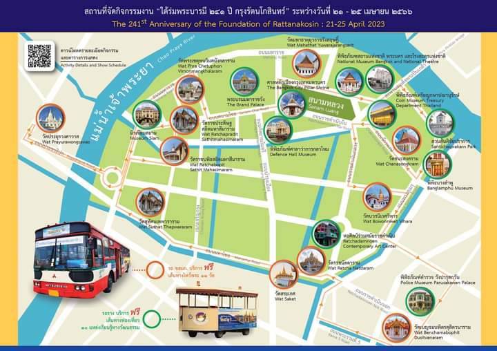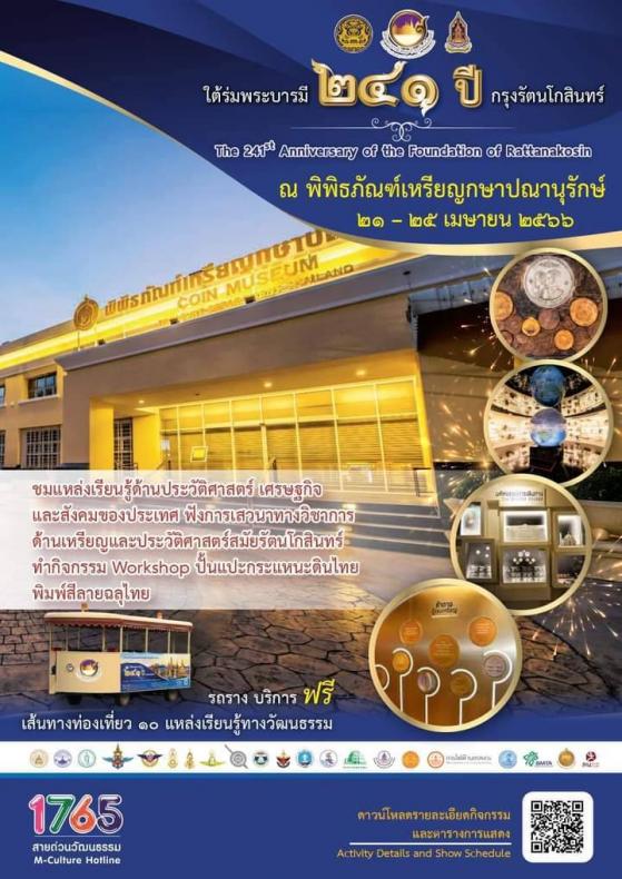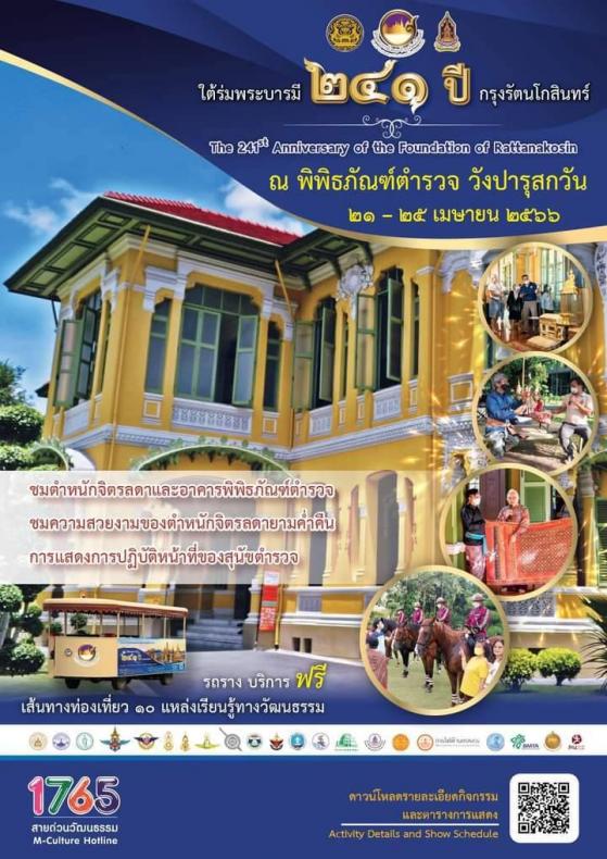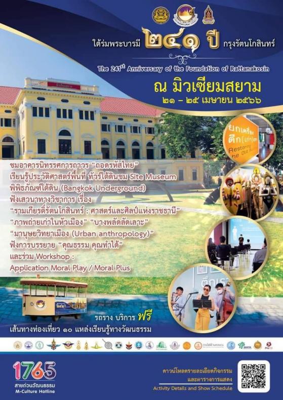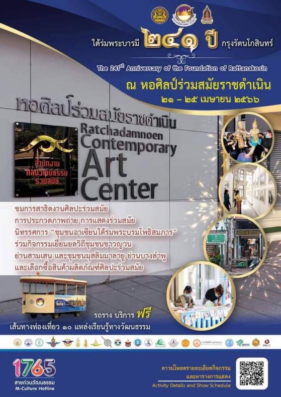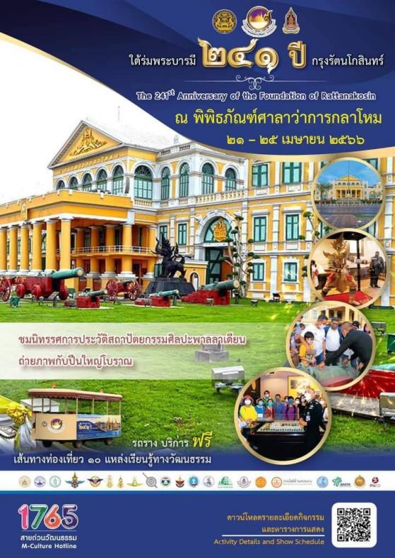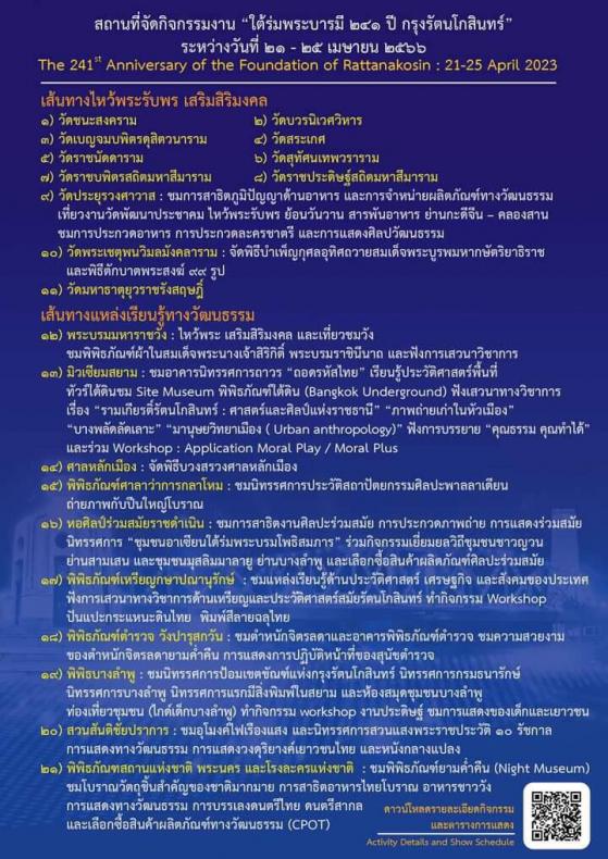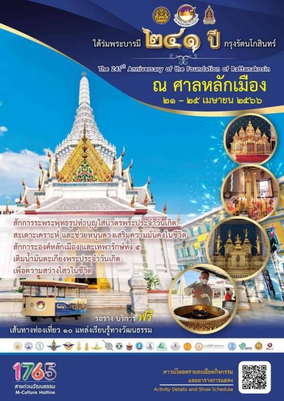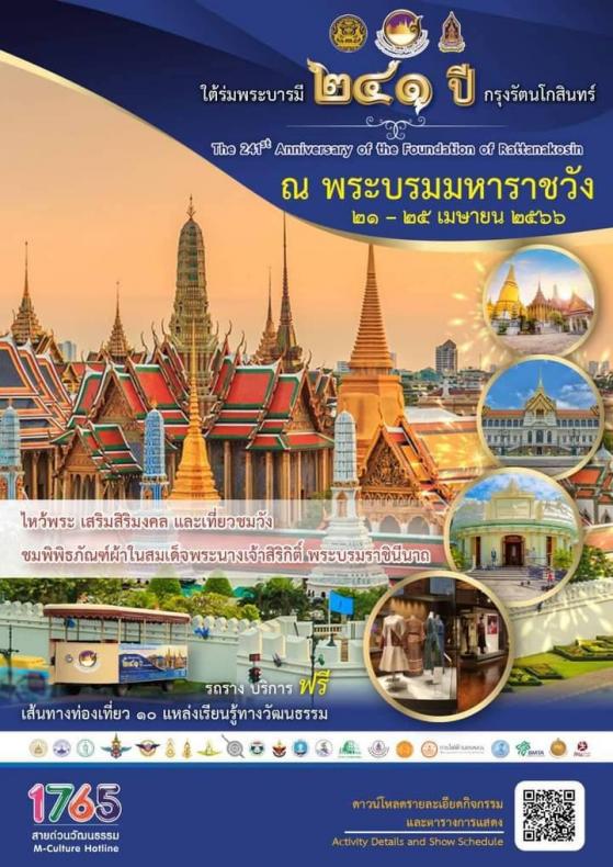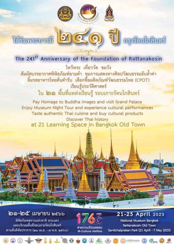กรมส่งเสริมวัฒนธรรม กระทรวงวัฒนธรรม ขอเชิญเที่ยวงานใต้ร่มพระบารมี 241 ปี กรุงรัตนโกสินทร์ ไหว้พระ เที่ยววัด ยลวัง สัมผัสพิพิธภัณฑ์ยามค่ำอันแสนงดงาม พร้อมชมการแสดงศิลปวัฒนธรรมที่หาชมได้ยาก เลือกซื้อผลิตภัณฑ์วัฒนธรรมไทย CPOT และลองลิ้มชิมรสอาหารอร่อย มากกว่า 50 บูธ ณ พิพิธภัณฑสถานแห่งชาติ พระนคร โรงละครแห่งชาติ และ 21 แหล่งเรียนรู้รอบเกาะรัตนโกสินทร์ ระหว่างวันที่ 21-25 เมษายน 2566 ตั้งแต่เวลา 12.00-21.30 น. ตระการตากับการแสดงแสงสีเสียง "แสงแห่งความภักดี ใต้ร่มพระบารมี 241 กรุงรัตนโกสินทร์ ระหว่างวันที่ 21 เมษายน ถึง 7 พฤษภาคม 2566 เวลา 18.00-21.00 น. ณ สวนสันติชัยปราการ
