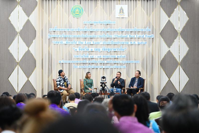 และในภาคบ่าย เวลา ๑๓.๐๐ น. มีการเสวนาหัวข้อ "การส่งเสริมและพัฒนาอาหารไทยถิ่น เพื่อการท่องเที่ยวและยกระดับเศรษฐกิจของชุมชนอย่างยั่งยืน” วิทยากรประกอบด้วย รศ.บำเพ็ญ เขียวหวาน ผู้เชี่ยวชาญด้านวิจัยภูมิปัญญาและการพัฒนาชุมชน พูดถึงความสำคัญและความพร้อมของการเกษตรในพื้นที่ เพื่อส่งเสริมและพัฒนาอาหารไทยถิ่น เชื่อมโยงไปสู่การสืบสานภูมิปัญญาและการพัฒนาชุมชน พท.ป.อุบลรัตน์ มโนศิลป์ ผู้เชี่ยวชาญด้านการแพทย์แผนไทยและการแพทย์ทางเลือก พูดถึงความสำคัญของโภชนาการ/ สมุนไพร องค์ประกอบหนึ่งที่สำคัญในอาหารถิ่นเพื่อส่งเสริม และพัฒนาอาหารไทยถิ่น ทั้งในด้านคุณค่าและมูลค่า นายจรงค์ศักดิ์ รองเดช (พี่สตังค์) พิธีกรและผู้ผลิตรายการ "ภัตตาคารบ้านทุ่ง” กล่าวถึงมุมมองในการหาจุดเด่นของอาหารถิ่นเพื่อการนำเสนอ วิธีการเล่าเรื่องอาหารไทยถิ่นในทุกภูมิภาค การสร้างสรรค์และเสริมสร้างภาพลักษณ์อาหารถิ่น โดยมี นายวรพงศ์ ผูกภู่ วิทยากรดำเนินรายการ ได้กล่าวสรุปสาระสำคัญในกรอบการทำงานของโครงการในปี ๒๕๖๗ อีกด้วย