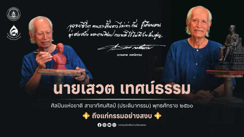 กรมส่งเสริมวัฒนธรรม โดยกองกองทุนส่งเสริมงานวัฒนธรรม ได้รับการประสานงานจากทายาทของนายเสวต เทศน์ธรรม ศิลปินแห่งชาติ สาขาทัศนศิลป์ (ประติมากรรม) พุทธศักราช ๒๕๖๐ ว่า นายเสวต เทศน์ธรรม ได้ถึงแก่กรรมอย่างสงบ เมื่อวันพุธที่ ๒๒ มกราคม ๒๕๖๘ เวลาประมาณ ๒๓.๐๐ น. ณ โรงพยาบาลรามาธิบดี สิริอายุ ๙๐ ปี