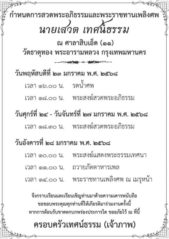 กำหนดการพิธีสวดพระอภิธรรมและพิธีพระราชทานเพลิงศพ ณ ศาลา ๑๑ วัดธาตุทอง พระอารามหลวง กรุงเทพมหานคร