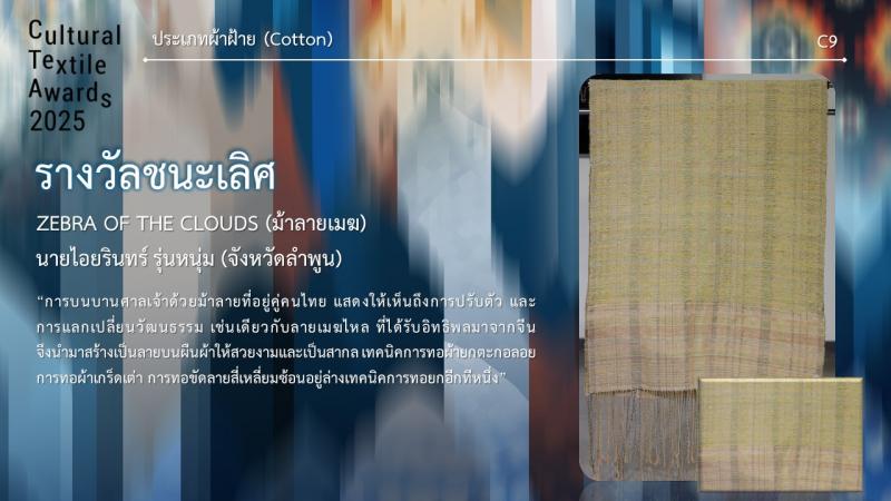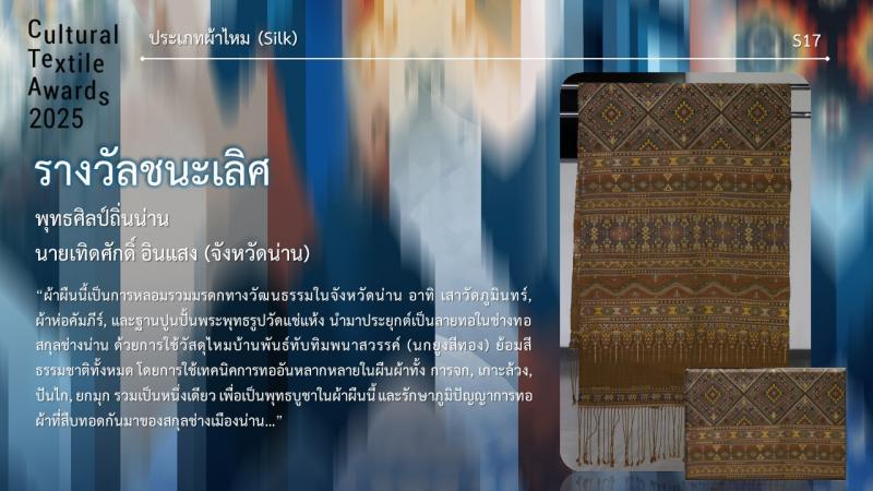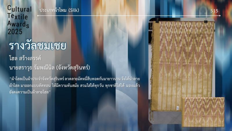 กรมส่งเสริมวัฒนธรรมได้แต่งตั้งคณะกรรมการผู้ทรงคุณวุฒิ/ผู้เชี่ยวชาญด้านผ้าไทย นักออกแบบแฟชั่น และอาจารย์มหาวิทยาลัยในสาขาที่เกี่ยวข้อง อาทิ ผศ.ดร.รวิเทพ มุสิกะปาน ผศ.ดร.ธีระยุทธ์ เพ็งชัย ผศ.ดร.วุฒิไกร ศิริผล ดร.กรกลด คำสุข ผ.ศ.ดร.กิตติ์ธนัตถ์ ญาณพิสิษฐ์ ดร.แพรวา รุจิณรงค์ นางสาวณัฐธิดา พละศักดิ์ นายฐากร ถาวรโชติวงศ์ นายสธน ตันตราภรณ์ และนายวิชระวิชญ์ อัครสันติสุข เป็นต้น เพื่อพิจารณาคัดเลือกและตัดสินผลงานสร้างสรรค์ทั้ง 3 ประเภท ให้ได้รับรางวัลทั้งสิ้น 24 ผลงาน ซึ่งมีนิสิตนักศึกษา ผู้ประกอบการ และประชาชนทั่วไป ส่งผลงานเข้าประกวดมากถึง 73 ผลงาน โดยแบ่งออกเป็น 3 ประเภท ได้แก่ ผ้าไหม ผ้าฝ้าย และสิ่งทอสร้างสรรค์ ซึ่งคณะกรรมการได้ร่วมกันพิจารณาคัดเลือกผลงานรอบแรกให้เหลือประเภทละ 12 ผลงาน รวมทั้งสิ้น 36 ผลงาน ทั้งนี้ ผู้ที่ผ่านการคัดเลือกในรอบแรกได้ดำเนินการสร้างสรรค์ผลงานจากแบบร่างเป็นผลงานจริง และส่งให้คณะกรรมการพิจารณาตัดสินหาผู้ได้รับรางวัลในแต่ละประเภท รวมทั้งสิ้น 24 ผลงาน เมื่อวันพุธที่ 25 มิถุนายน 2568 เวลา 13.00 – 16.30 น. ณ หอนิทรรศการ G23 ชั้น 3 อาคารนวัตกรรม ศาสตราจารย์ ดร.สาโรช บัวศรี มหาวิทยาลัยศรีนครินทรวิโรฒ ซึ่งกรมส่งเสริมวัฒนธรรมได้ประกาศผลการตัดสินเป็นที่เรียบร้อยแล้ว ตามรายชื่อ ดังต่อไปนี้