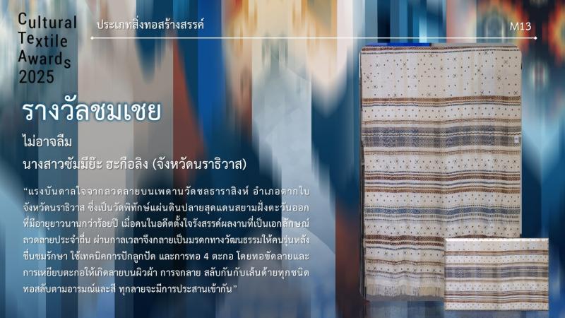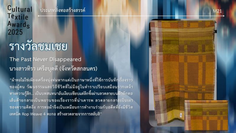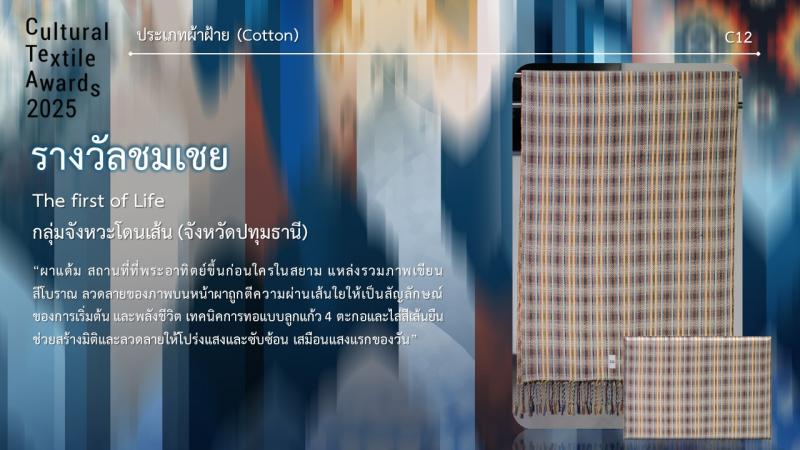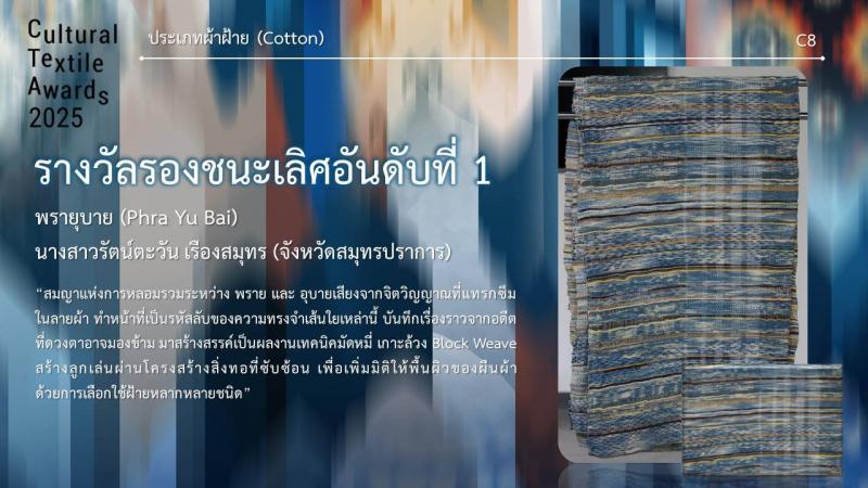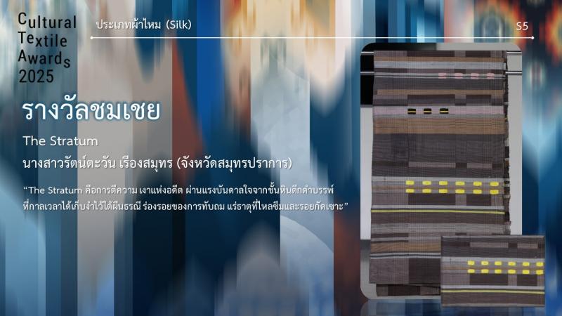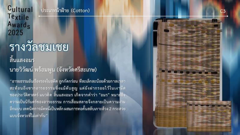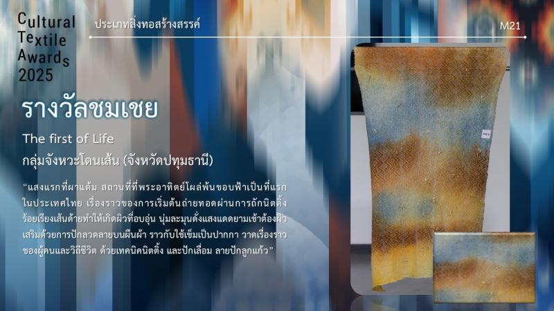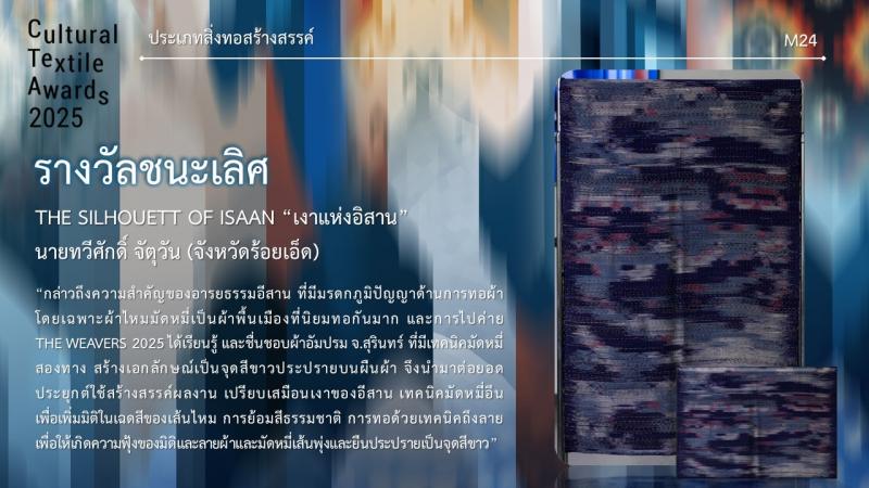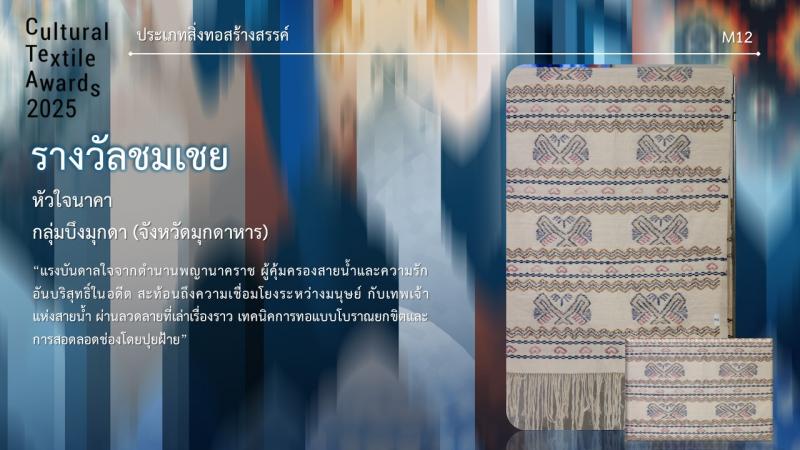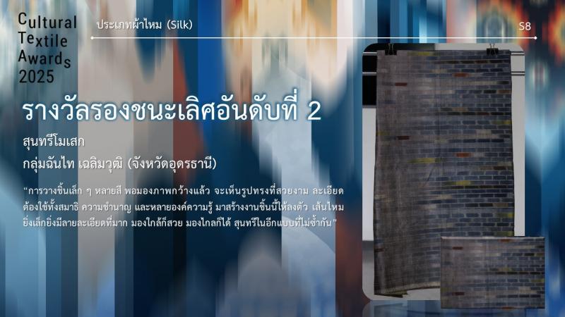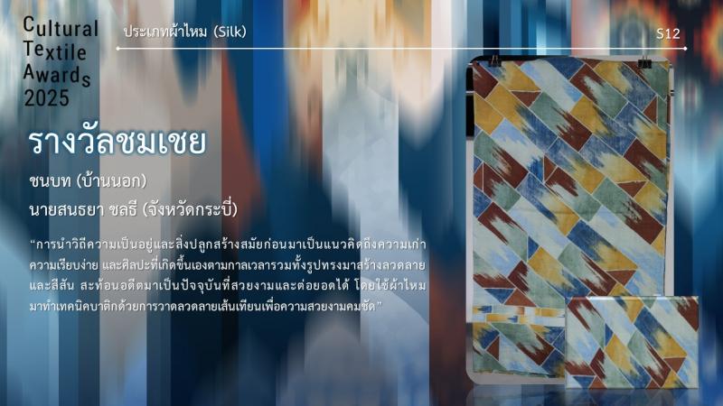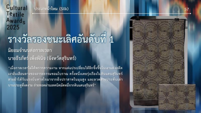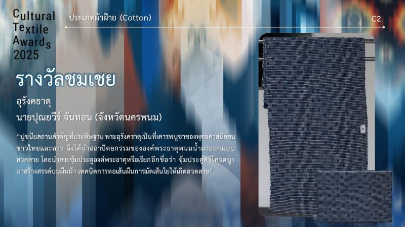 กรมส่งเสริมวัฒนธรรมกำหนดจัดงานมอบรางวัล กิจกรรมการประกวดออกแบบลายผ้าไทยสู่สากลเพื่อการต่อยอดและพัฒนา (Cultural Textile Awards 2025) ภายใต้โครงการพัฒนามรดกภูมิปัญญาทางวัฒนธรรมผ้าไทยสู่สากล ประจำปี 2568 ในวันพุธที่ 30 กรกฎาคม 2568 เวลา 15.30 น. ณ Sphere Gallery ชั้น M ศูนย์การค้า เอ็มสเฟียร์ โดย นางยุถิกา อิศรางกูร ณ อยุธยา อธิบดีกรมส่งเสริมวัฒนธรรม เป็นประธานในงานฯ นอกจากนี้ยังจัดแสดงผลงานผู้ได้รับรางวัลฯ ระหว่างวันที่ 30 - 31 กรกฎาคม 2568