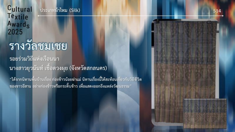 รางวัลชมเชย ชื่อผลงาน รอยร่วมวิถีแห่งเรือนนา ชื่อผู้ประกวด นางสาวยุวนันท์ เชื้อดวงผุย จากจังหวัดสกลนคร