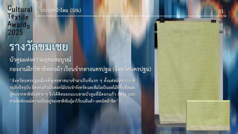รางวัลชมเชย ชื่อผลงาน บัวตูมแห่งความอุดมสมบูรณ์ ชื่อผู้ประกวด กองงานฝึกวิชาชีพทอผ้า เรือนจำกลางนครปฐม จากจังหวัดนครปฐม
