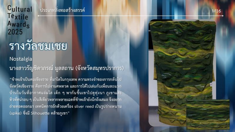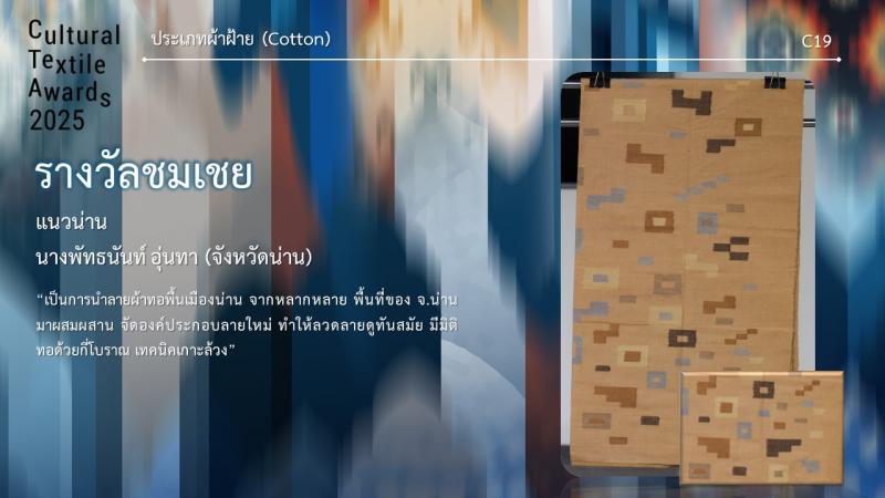 รางวัลชมเชย ชื่อผลงาน แนวน่าน ชื่อผู้ประกวด นางพัทธนันท์ อุ่นทา จากจังหวัดน่าน