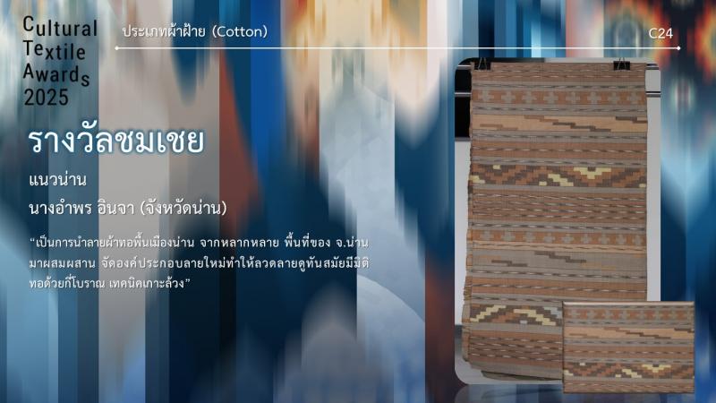 รางวัลชมเชย ชื่อผลงาน แนวน่าน ชื่อผู้ประกวด นางอำพร อินจา จากจังหวัดน่าน