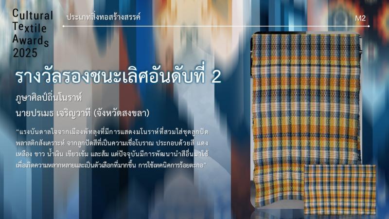 รางวัลรองชนะเลิศ อันดับ 2 ชื่อผลงาน ภูษาศิลป์ถิ่นโนราห์ ชื่อผู้ประกวด นายปรเมธ เจริญวาที จากจังหวัดสงขลา